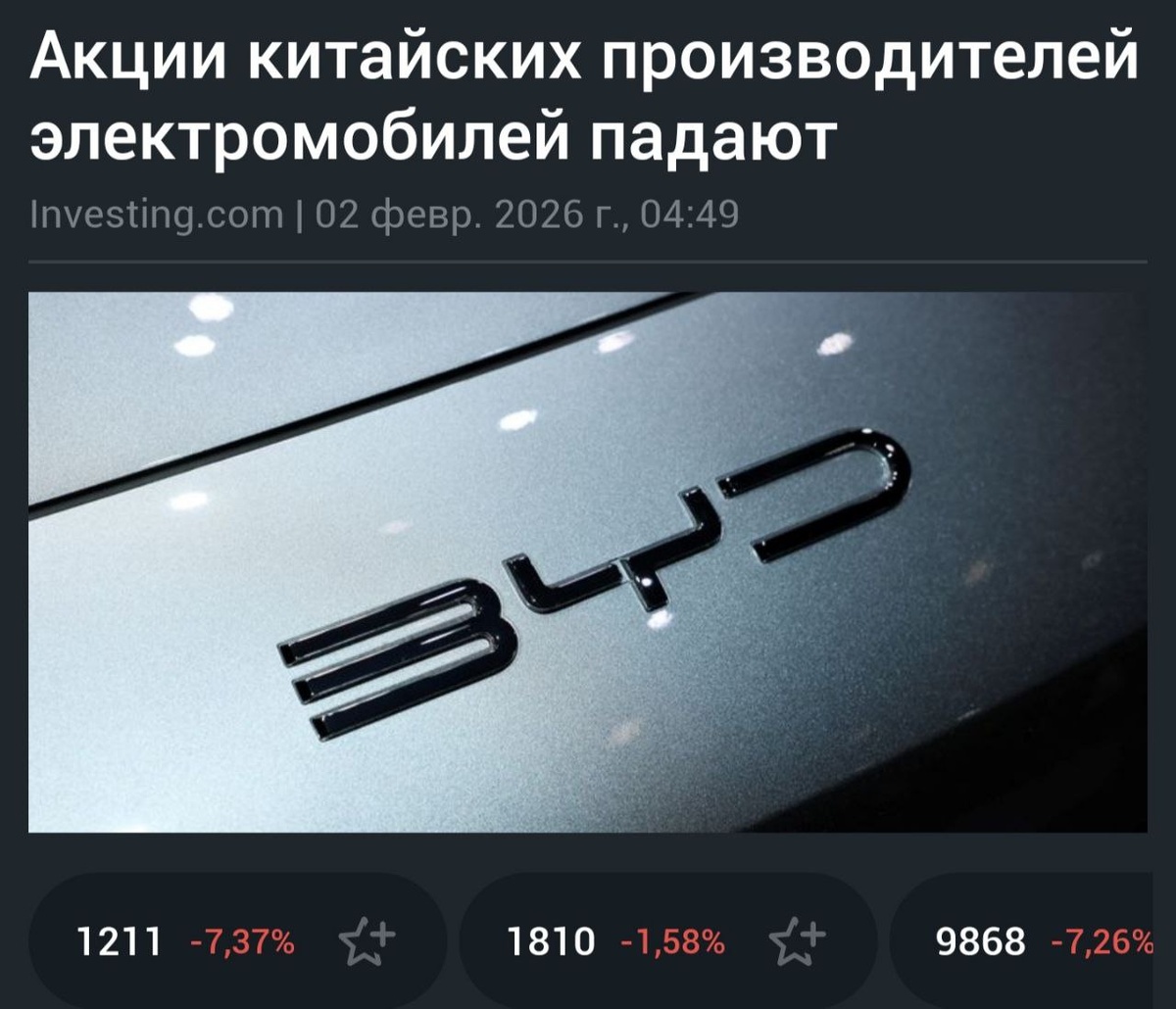начало 2026 года и возобновили опасения относительно внутреннего спроса Акции BYD Co (HK:1211), котирующиеся в Гонконге, упали на 8%😱, достигнув самого низкого уровня за год, после того как автопроизводитель сообщил о поставках 210 051 автомобиля, что примерно на 30% меньше в годовом исчислении. Это снижение стало для BYD пятым месяцем подряд падения продаж, на которые повлияли более слабые показатели гибридных автомобилей с подзарядкой от сети. Акции других китайских производителей электромобилей также снизились после смешанных результатов поставок. Xpeng Inc (HK:9868) поставила 20 011 автомобилей, что на 34% меньше, чем годом ранее, в то время как #Li Auto (HK:2015) отчиталась о 27 668 единицах, что на 8% меньше в годовом исчислении. Xpeng рухнули на 9%, а Li Auto упали на 4%. #NIO Inc (HK:9866) снизились более чем на 7%. #NIO поставила 27 182 автомобиля, что почти вдвое больше показателя годичной давности, но ниже уровня декабря, отражая сезонную слабость. Акции Xiaomi (HK:181
