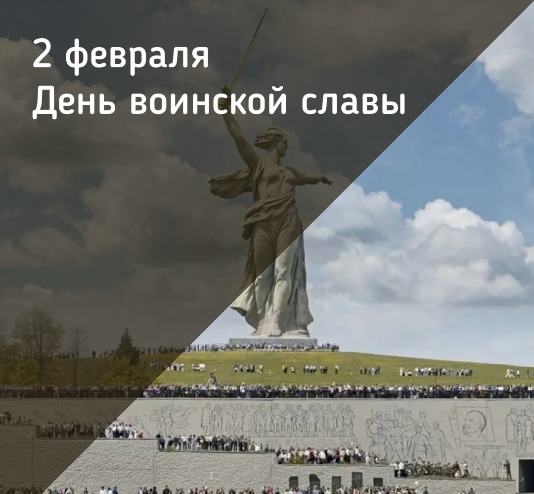 2 февраля в России ежегодно отмечается День воинской славы — День разгрома советскими войсками немецко-фашистских войск в Сталинградской битве (1943 год). Дата установлена в марте 1995 года федеральным законом «О днях воинской славы и памятных датах России». Сталинградская битва продолжалась с 17 июля 1942 года по 2 февраля 1943 года. Цель наступления войск нацистской Германии и её союзников — захват большой излучины Дона, волгодонского перешейка и Сталинграда (современный Волгоград). Осуществление этого плана блокировало бы транспортное сообщение между центральными районами СССР и Кавказом, создало бы плацдарм для дальнейшего наступления с целью захвата кавказских месторождений нефти. Сталинградскую битву можно разделить на два периода: 1. Оборонительный — с 17 июля по 18 ноября 1942 года. За это время советские войска успешно противостояли атакующим действиям противника, который планировал одним мощным ударом взять Сталинград. 2. Наступательный — начался 19 ноября 1942 года и прод
