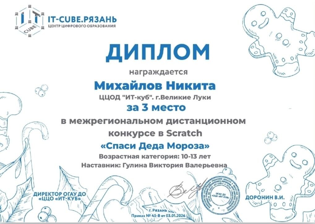 🏆 Великолукский «IT-куб» занял призовое место в межрегиональном конкурсе по Scratch «Спаси Деда Мороза», проходившем в Рязани. 🎯 В категории для детей 10-13 лет третье место занял Никита Михайлов. ✨ Также в конкурсе участвовали Дмитрий Мамонтов и Максим Шутенков. 👉ВЛуки.ру