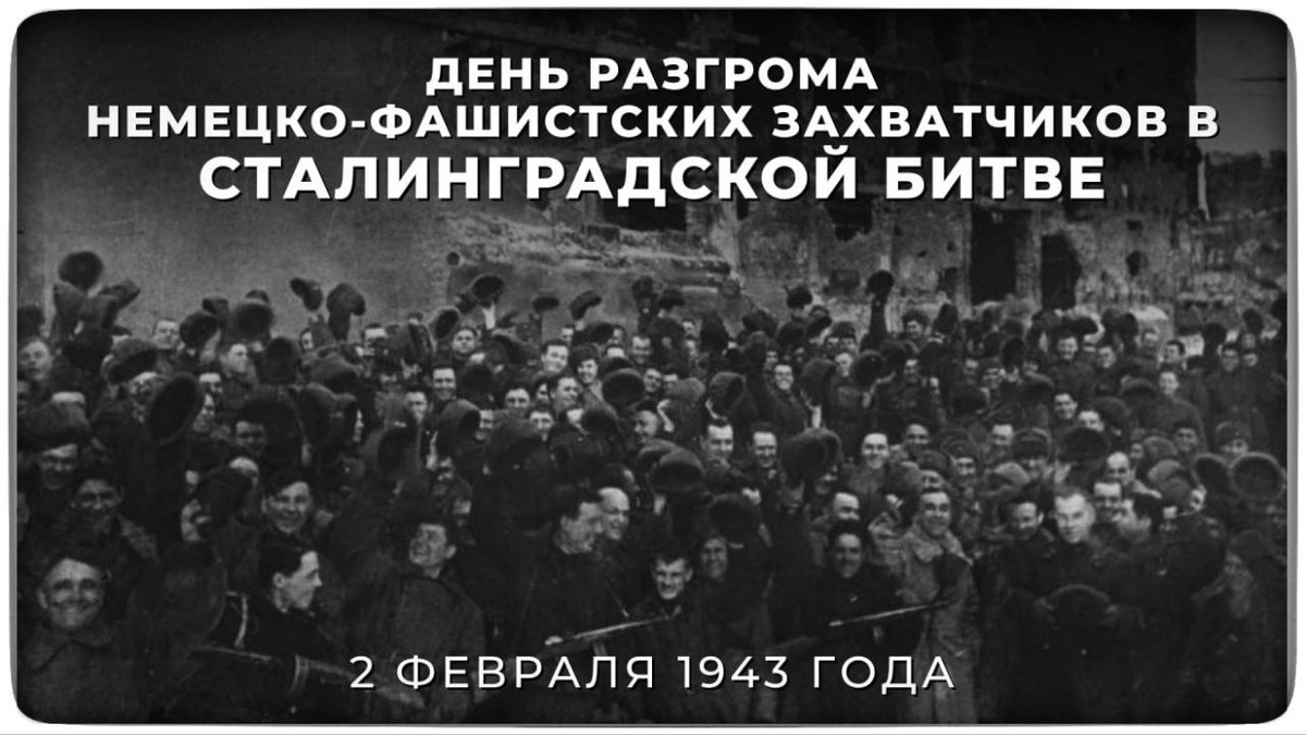 День воинской славы. 02 февраля 1943 года завершилась Сталинградская битва — одно из самых тяжёлых, ожесточённых сражений Великой Отечественной и всей Второй мировой войны, переломившее дальнейший ход той страшной и кровавой бойни. Сталинградская Битва продолжалась 200 дней и ночей и превзошла по размаху и напряжённости все предшествующие сражения в мировой истории. Бои в Сталинграде шли за каждый переулок, каждый дом, каждый метр земли. На разных этапах с обеих сторон в битве было задействовано более 2,1 миллионов человек. Нацистские захватчики безуспешно пытались сломить боевой дух защитников Сталинграда — несмотря на натиск врага, бросившего к Волге все силы, красноармейцы, проявив отвагу, мужество и героизм, выстояли и одержали победу, которая во многом и решила исход войны. Немецкая военная машина потерпела тяжелейшее для неё, катастрофическое поражение, от которого, как показала история, уже не смогла оправиться. Под Сталинградом Красная армия доказала всему миру — Третий ре