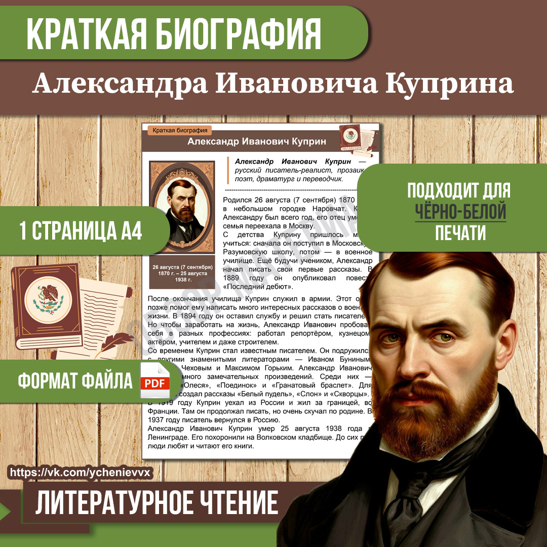 📄 Краткая биография русского писателя, поэта Александра Ивановича Куприна расположена на одном листе А4. Материал представлен в формате PDF. ❗ Краткую биографию Александра Ивановича Куприна можно скачать здесь. 👤 Александр Иванович Куприн — русский писатель-реалист, прозаик, поэт, драматург и переводчик. 📍 На заметку! В настройках печати вашего принтера можно выбрать такие варианты: размещение одного материала на одном листе A4 или печать двух копий материала на одном листе A4 (в этом случае каждая копия будет размером A5). 👉 Биография Александра Ивановича Куприна доступна для печати как на цветном, так и на чёрно-белом принтере. 🔔 Изучение биографии писателя способно пробудить у ученика любопытство не только к работам самого автора, но и к его литературному окружению, включая произведения современников, предшественников и последователей. АВТОР «Учение»: материалы к урокам от ВВХ © #литературноечтение #школа #школароссии #начальныеклассы #образование #биография #памятка