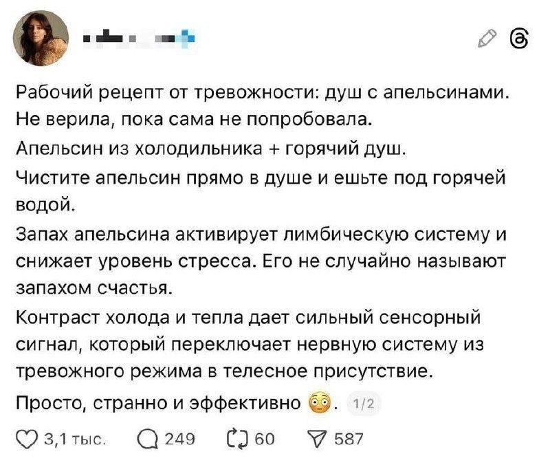Схема простая: после тяжёлого дня достаёшь апельсин из холодильника, чистишь его и ешь прямо под тёплой водой. Аромат цитруса ощущается в разы сильнее, тепло усиливает эффект — нервная система получает максимальное расслабление. Пробуем? 👉 Подписаться на канал