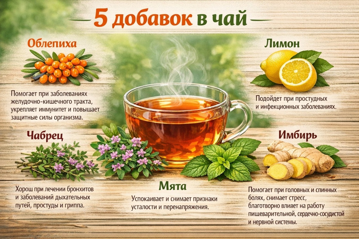 В холода чай помогает не только согреться, но и, например, снизить артериальное давление, уменьшая тем самым риск инсульта. А если подобрать правильную добавку, то напиток станет ароматнее и полезнее. Ниже 5 самых, по мнению экспертов, полезных добавок для чая. Облепиха, пожалуй, мировой рекордсмен по содержанию полезных веществ в своем составе. Витамины С, группы В, Е, К, РР, железо, марганец, органические кислоты — и это далеко не полный список. Облепиха помогает при заболеваниях желудочно-кишечного тракта, кишечника, укрепляет иммунитет и повышает защитные силы организма. Лимон принадлежит к семейству цитрусовых и богат витамином С. Чай с лимоном отлично помогает от простудных и инфекционных заболеваний. Для того чтобы получить максимум витаминов, съедайте дольку лимона после чаепития. Чай с добавлением чабреца имеет по-настоящему изысканный и незабываемый аромат и вкус. Удивительные лечебные свойства этого растения обусловлены большим количеством эфирного масла, которое входит в со