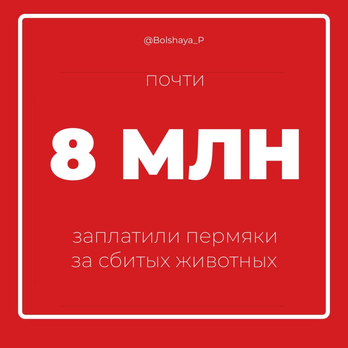 Чаще всего такие аварии происходили в Перми, а также в Кунгурском и Октябрьском округах. В Минприроды общий ущерб оценили почти в 7,8 млн рублей. Автомобилистам грозят штрафы: за лося придется заплатить 80 тысяч рублей, за кабана или северного оленя — 30 тысяч. ❤️ Подписаться | Предложить новость | Дать «буст» | Мы в MAX