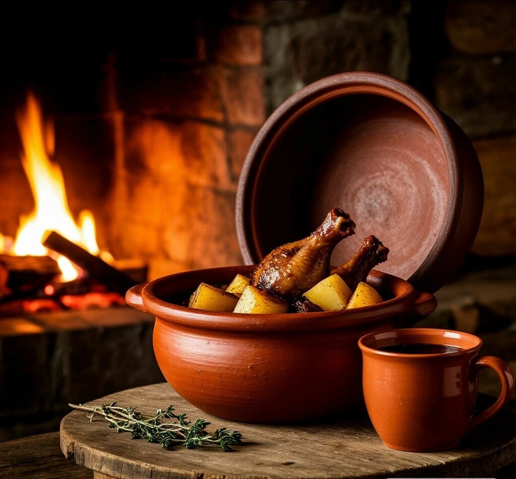 5. 🥘 Собираем в горшочки! В керамические горшочки разложи обжаренные овощи. Сверху помести утиный окорочек. В каждый горшочек положи по зубчику чеснока и веточке тимьяна. Залей соусом из мёда и соевого соуса, затем добавь воды или бульона, чтобы жидкость доходила примерно до половины высоты окорочка. 🌊