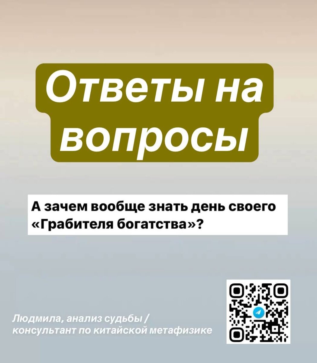 А зачем вообще знать день своего грабителя богатства? Правильный ответ: Чтобы контролировать энергию грабителя: совершить траты осознанно, избежав рисков потери денег С уважением, Людмила, анализ судьбы / консультант по китайской метафизике ❤️
