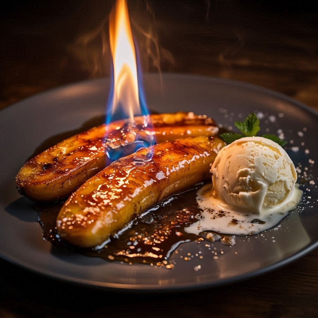 Эффектный ресторанный десерт, где театр пламени превращает простые бананы в элегантное блюдо с карамельными нотами.