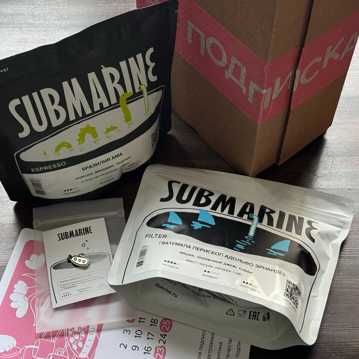 Приехала свежая подписка от Submarine! В этот раз в эспрессо – гейша углекислотной мацерации из Бразилии с заманчивым описанием вкуса: черешня, мандарин и леденцы. Ради такого лота и кофемашину купить не грех! 😅 А в фильтре – Гватемала с обработкой "твист" и оценкой Q87. Субмарина продолжает радовать меня лотами с обработкой твист в фильтре. Это уже четвертый раз на моей памяти. Кроме кофе в коробке обнаружился металлический значок в виде логотипа субмарины. Пристегну его себе на рюкзак. 😊 P.S.: На кофе и подписку от Submarine у меня есть промокоды. Ищите их в старых постах или на сайте. @Кофезавр