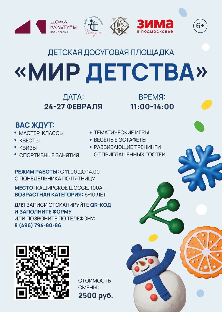 ✨ Открыта запись на детскую досуговую площадку «Мир детства». Даты: 24–27 февраля Время: 11:00–14:00 (пн–пт) Возраст: 6–10 лет Адрес: Каширское шоссе, 100А Стоимость смены: 2500 руб. В программе: - мастер-классы - квесты и квизы - спортивные занятия - тематические игры - весёлые эстафеты - развивающие тренинги от приглашённых гостей 🚫 Возраст: 6+ 🏢 Дворец культуры и спорта «Мир» 📍 г. Домодедово, Каширское шоссе, д.100А 💰 Цена: 2500 ₽ ✅ Мероприятия Домодедово https://dzen.ru/id/66f10385cc4c5a16f7b5fb02 http://vk.com/domodedovo_events http://dzen.ru/domodedovo_events