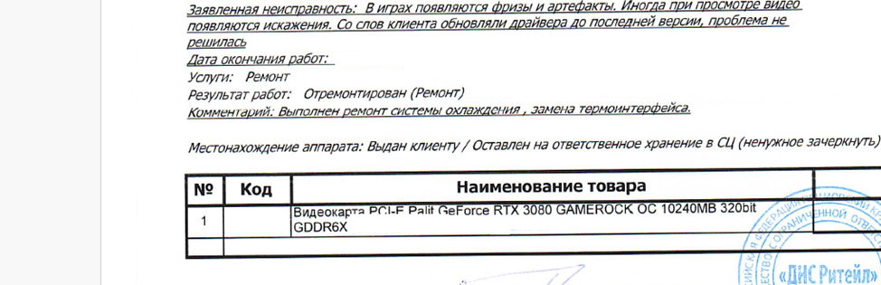 Покупатель приобрел видеокарту PCI-E Palit GeForce RTX 3080 в ДНС. В период использования были выявлены фризы/артефакты. Видеокарты сдана в ДНС для проверки качества и ремонта. Продавцом был выполнен следующий перечень работ по ремонту: