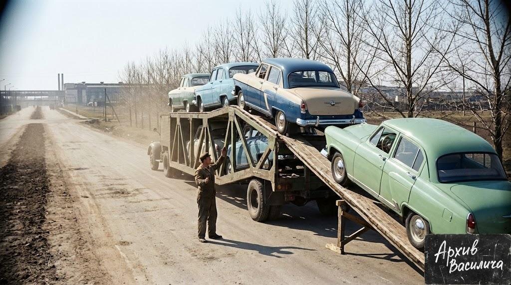 Видел сегодня на кольцевой, как современный автовоз ловко лавирует в потоке, прижимая к себе десяток сверкающих иномарок. Глядя на эти «этажерки», невольно вспомнил времена, когда доставка новенького «Москвича» или «Волги» превращалась в настоящую войсковую операцию. В сороковых и пятидесятых годах никто особо не мудрил — новенькие машины грузили на обычные бортовые грузовики или старые прицепы-танковозы, оставшиеся после войны. Эти тяжелые платформы могли утащить на себе танк, а на них сиротливо жались две-три легковушки. Главная беда была даже не в тесноте, а в том, как эти сокровища на колесах спустить на землю, не поцарапав блестящие бока. Мощные прицепы были совсем не приспособлены для аккуратной выгрузки, и каждое движение требовало ювелирной точности. Позже Минавтопром решил, что надежнее всего возить технику по железной дороге. Машины грузили на открытые платформы и везли до ближайшего крупного узла. В моих старых тетрадках в клеточку за 1982 год есть запись о том, как мы на М