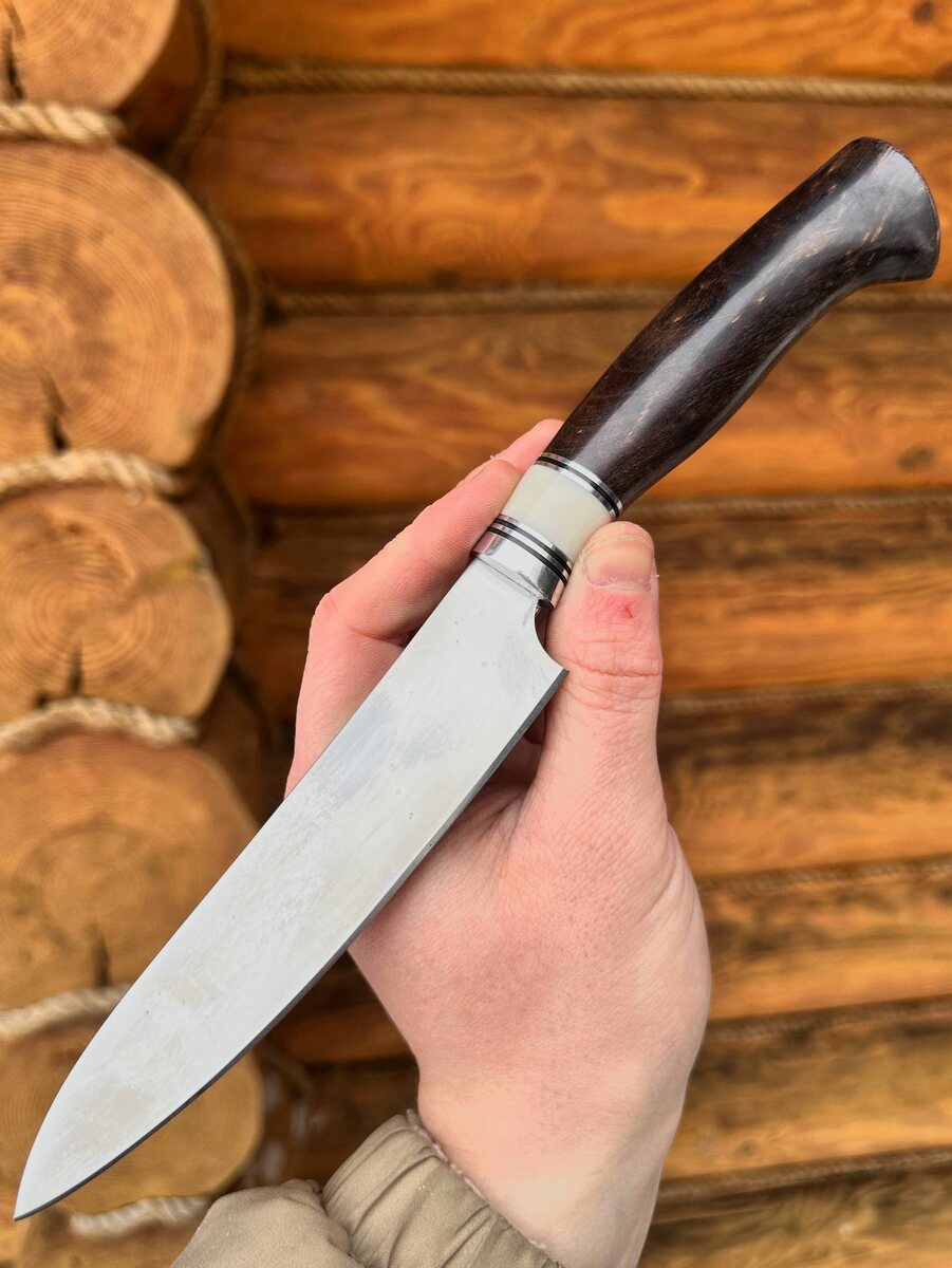 Сталь всех дольше держит заточку и самый агрессивный рез Рукоять на ноже выполнена из стабилизированной карельской березы коричневой и акрил. Нож режет как бритва. Твердость клинка (HRC): 70 Цена за нож: 21.800 рублей. В комплекте идут ножны из натуральной кожи. Можем сделать формованные ножны +8000 рублей. Для заказа писать на @Nazarklinokbot или по тел +79101343831 WhatsApp/Viber