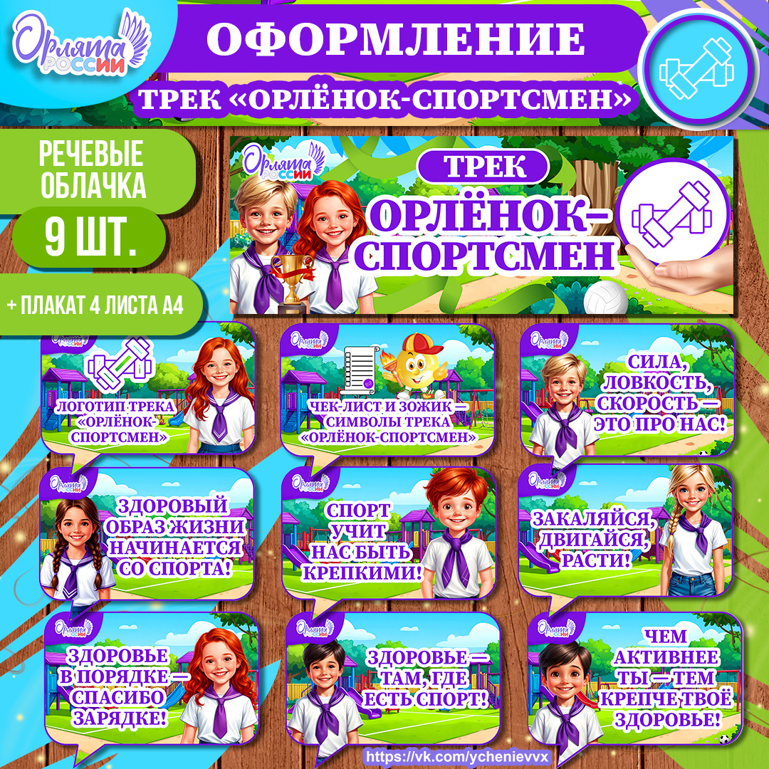 👉 Хотите сделать занятия по программе «Орлята России» ещё интереснее и зрительно привлекательнее? Представляю комплект оформления для трека «Орлёнок-Спортсмен»! С ним вы легко создадите вдохновляющую атмосферу и подчеркнёте ценность занятия спортом. ❗Данный комплект оформления к треку "Орлёнок-Спортсмен" можно СКАЧАТЬ здесь. Что вы получаете ✅ 9 речевых облачков с мотивирующими фразами о важности спорта, здорового образа жизни, с логотипом трека и символом. Отлично подходит для размещения на стенах, стендах, доске или в фотозоне. ✅ Плакат баннер «Трек Орлёнок-Спортсмен» — эффектный визуальный акцент. Собирается из 4 вертикальных листов формата А4, что удобно для печати и размещения в любом кабинете или холле. 👉 Почему это удобно • Всё готово к печати. Не нужно придумывать дизайн и подбирать цитаты — я сделала это за вас. • Формат PDF. Легко открыть на любом устройстве, распечатать в нужном количестве и качестве. • Универсальность. Материалы подойдут для классных часов, открытых заня