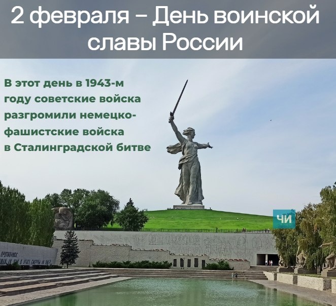 В этот день в 1943 г. советские войска разгромили немецко-фашистские войска в Сталинградской битве, одной из крупнейших в Великой Отечественной войне. Она началась 17 июля 1942 г. и закончилась 2 февраля 1943 г.. Это событие положило начало коренному перелому в ходе войны. 22 декабря 1942 г. была учреждена медаль «За оборону Сталинграда», которую получило более 750 тысяч защитников города. 8 мая 1965 г. Сталинград был удостоен звания «Города-героя». На фотографии – памятник-ансамбль «Героям Сталинградской битвы» с главным монументом «Родина-мать зовёт!» на Мамаевом кургане. Это возвышенность на правом берегу реки Волги в Центральном районе Волгограда, где во время Сталинградской битвы происходили ожесточённые бои. На Мамаевом кургане существует несколько братских и индивидуальных могил, в которых покоится прах более чем 35 000 защитников Сталинграда. | 📰Новости Алькеевского района📸 MAX-канал - подпишитесь. Вконтакте - подпишитесь. Сайт - посмотреть.