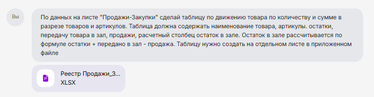 На практике часто возникает задача, когда на основании данных из одной таблицы нужно сделать другую для проверки данных или отчета. В этом случае поможет такой промт. (Исходную таблицу лучше всего прикрепить, так как если этого не сделать, ответ получится очень общим) В ответ получаем рекомендации от GPT, которые будем выполнять по шагам. После первых двух шагов получаем такой результат Добавляем фиксированный список товаров и артикулов. Далее копируем формулы и переносим их в excel (полностью формулы можно посмотреть здесь) Выполнив все рекомендации GPT получим такую таблицу Файл в excel с исходными данными и проверочными таблицами можно посмотреть здесь