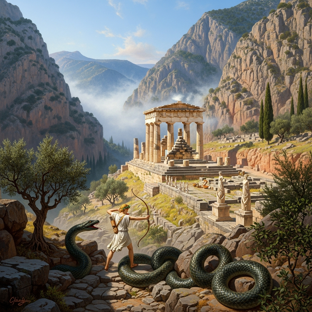 Дельфы, в теснине Парнаса, были не просто городом — они считались пупом Земли. Здесь, по древним верованиям, сталкивались миры богов и людей. Ущелья и родники этой долины были священны для Муз, покровительниц искусств, но именно сюда, на место древнего хтонического оракула богини Геи, пришёл светоносный Аполлон. Согласно мифу, здесь он победил чудовищного змея Пифона, охранявшего прорицалище. Чтобы искупить кровопролитие, Аполлон на девять лет удалился в далёкую Темпейскую долину, а вернувшись, принёс с собой ветви священного лавра. В память о победе он учредил агон — состязание в исполнении пеана, торжественного гимна в его честь, под аккомпанемент кифары. Так из семени мифа, в котором переплелись насилие, искупление и прославление, проросли первые Пифийские игры. Изначально они проводились раз в восемь лет, в память о восьмилетнем цикле искупления бога.
