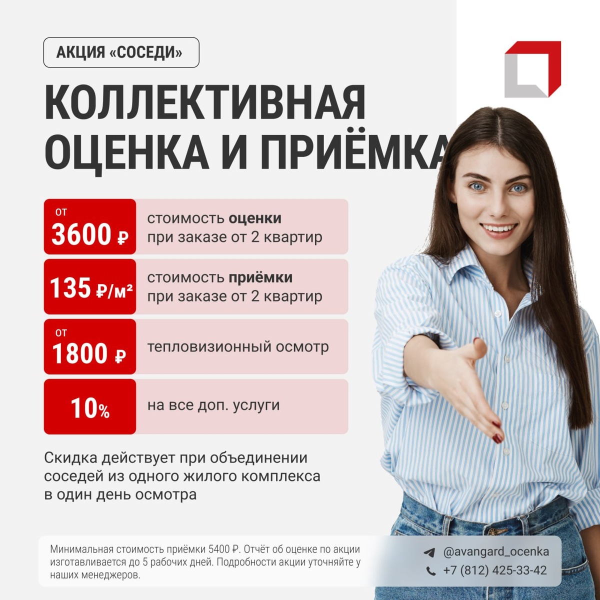 Вы можете объединиться с соседями по дому в коллективный заказ и получить оценку, приемку и тепловизионный осмотр по более выгодной цене! Проинформируйте своих соседей о возможности получения коллективной скидки. При записи дольщик должен сообщить, что он хочет записаться в коллектив, сообщить название ЖК, дату осмотра и последние 4 цифры номера телефона соседа. Квартиры должны находиться в одном жилом комплексе и осмотр должен проходить в один день, при этом время осмотра не важно. При коллективном заказе от 2 квартир, вы получите скидку 10% на все услуги. Отчёт по коллективной заявке подготавливается до 5 дней с момента получения всех документов. Запись и консультация: 📱 +7 (812) 425-33-42 🌐 @avangardocenka