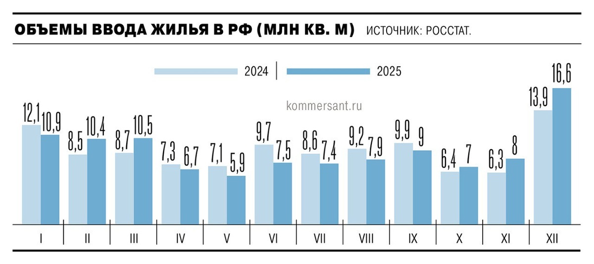 ✔️ Президент НОСТРОЙ Антон Глушков прокомментировал изданию «Коммерсантъ» итоги ввода жилья в 2025 году и дал прогнозы на 2026 год. 📰 По данным Росстата за 2025 год ввод жилья в РФ вырос — на 0,4%, положительная годовая динамика обусловлена темпами ввода ИЖС, на который пришлось 59% объема сданного в эксплуатацию жилья. Сдача в эксплуатацию частных домов прибавила 2%, а многоквартирных — напротив, упала на 2%. 💬 По мнению Антона Глушкова, динамика ввода жилья в 2025 году была «умеренно позитивной и в целом стабильной» — то, что общий объем ввода показал рост, говорит о сохранении активности в строительстве, несмотря на жесткие финансовые условия, рост себестоимости и сдержанный спрос. 📈 Глава НОСТРОЙ считает, что в 2026 году резкого роста рынка ожидать не приходится, но при отсутствии макроэкономических шоков возможна динамика за счет ИЖС, интерес к которому остается устойчивым, а также отдельных проектов МКД, запущенных ранее. 🪙 Сектор многоквартирных домов, как отмечает Антон