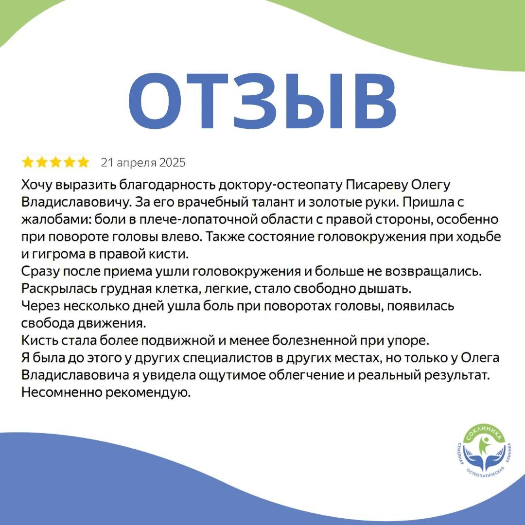 Сегодня хотим поделиться отзывом одного из наших пациентов📨 Это один из многих отзывов, подтверждающих эффективность системно-целостного подхода нашей клиники. Такой подход позволяет добиваться заметного результата буквально за несколько приёмов при целом ряде проблем. Мы работали не с отдельным симптомом, а с причинами нарушений, благодаря чему удалось: ▫️снять головокружения; ▫️восстановить подвижность шеи и плечевого пояса; ▫️улучшить дыхание за счёт работы с грудной клеткой; ▫️уменьшить боль и вернуть функциональность кисти. Во многих случаях такие результаты достигаются всего за несколько приёмов. 🫶🏻Гордимся тем, что можем вернуть пациентам свободу движения, комфорт и качество жизни благодаря профессионализму наших врачей и комплексной работе с телом. Если вы хотите убедиться в эффективности нашего подхода, приглашаем вас на приём в «СОКЛИНИКУ», где опытные остеопаты и неврологи помогут найти решение именно вашей проблемы: +7 (495) 532-63-26 +7 (925) 182-52-91 📍ул. Кашенкин Лу