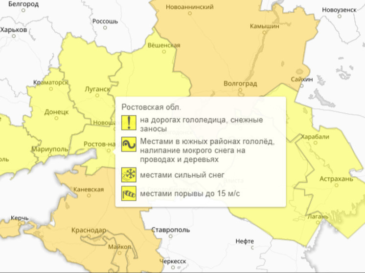 Желтый уровень погодной опасности введен в Ростовской области из-за непогоды. Данные взяты из показателей Гидрометцентра. Местами в регионе прогнозируется метель. Сильный снегопад будет наблюдаться до 6:00 3 февраля. Также в Ростовской области будет сильный ветер. Сильные порывы ветра до 15 метров в секунду будут наблюдаться в период с 18:00 2 февраля до 6:00 3 февраля. Помимо этого в регионе прогнозируются гололедно-изморозевые отложения. Гололед, налипание мокрого снега и снежные заносы продлятся до 18:00 4 февраля. В связи с непогодой водителям рекомендуется быть особенно внимательными на дорогах. Важно соблюдать скоростной режим, сохранять безопасную дистанцию до впереди едущего транспорта, а также не делать резких маневров. Фото: Гидрометцентр