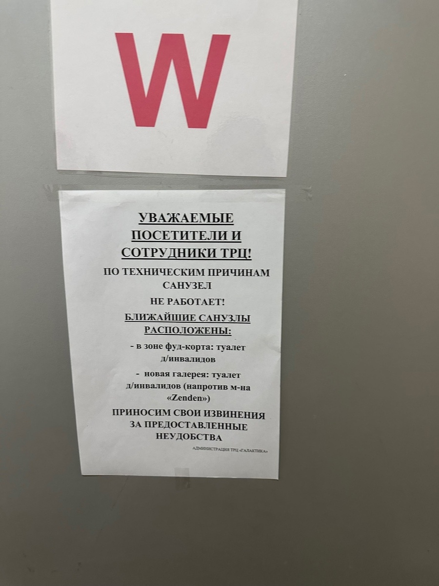 Ничего не меняется. ПРЕДУПРЕЖДЕНИЕ!!! Кто собирается за покупками в Галактику, перед выходом из дома не рекомендуется употреблять много жидкости, лишнего не кушать) Два туалета на весь ТРЦ для инвалидов и те не закрываются. Сотрудники так-же в восторге от данной информации, передают администрации ТРЦ отдельный респект и "уважение👍"