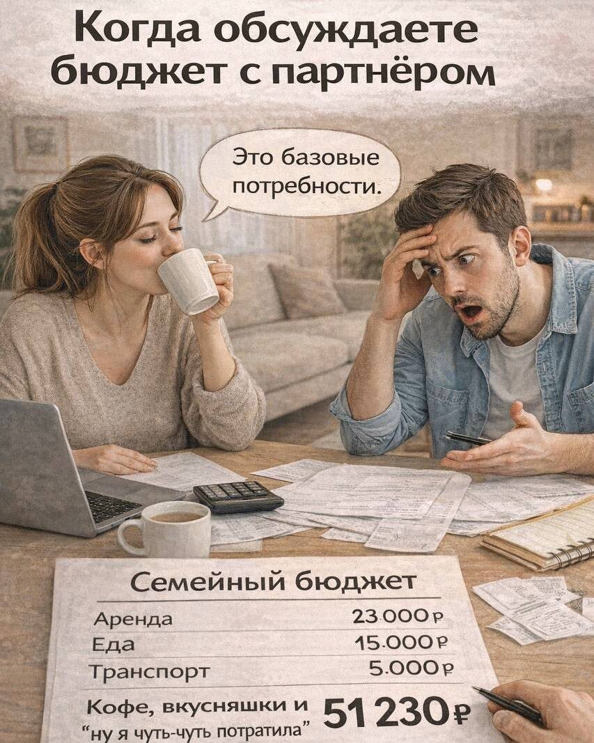 ? У каждой пары свой: – Общий котел: деньги таинственным образом перетекают из его кармана в её сумочку и обратно. Главный вопрос вечера: «Дорогой, а куда делись те 500 рублей?» – Мой — наш, твой — твой: он платит за квартиру, отпуск, машину и корм для кота. Она работает «для себя». Его бюджет — Excel-таблица. Её бюджет — «ой, какая прелесть, надо брать!». – Есть мои, есть наши, но твои — это загадка: общий счёт на продукты и коммуналку. Всё остальное — священная личная территория. Попытка задать вопрос «На что потратил?» приравнивается к объявлению холодной войны. А у вас какой жанр? Делитесь в комментариях, посмеемся или поплачем вместе! 🤩🤩 Кроме шуток, конечно, главное — чтобы система (какая она не была бы) работала и приносила комфорт и удовольствие обоим!