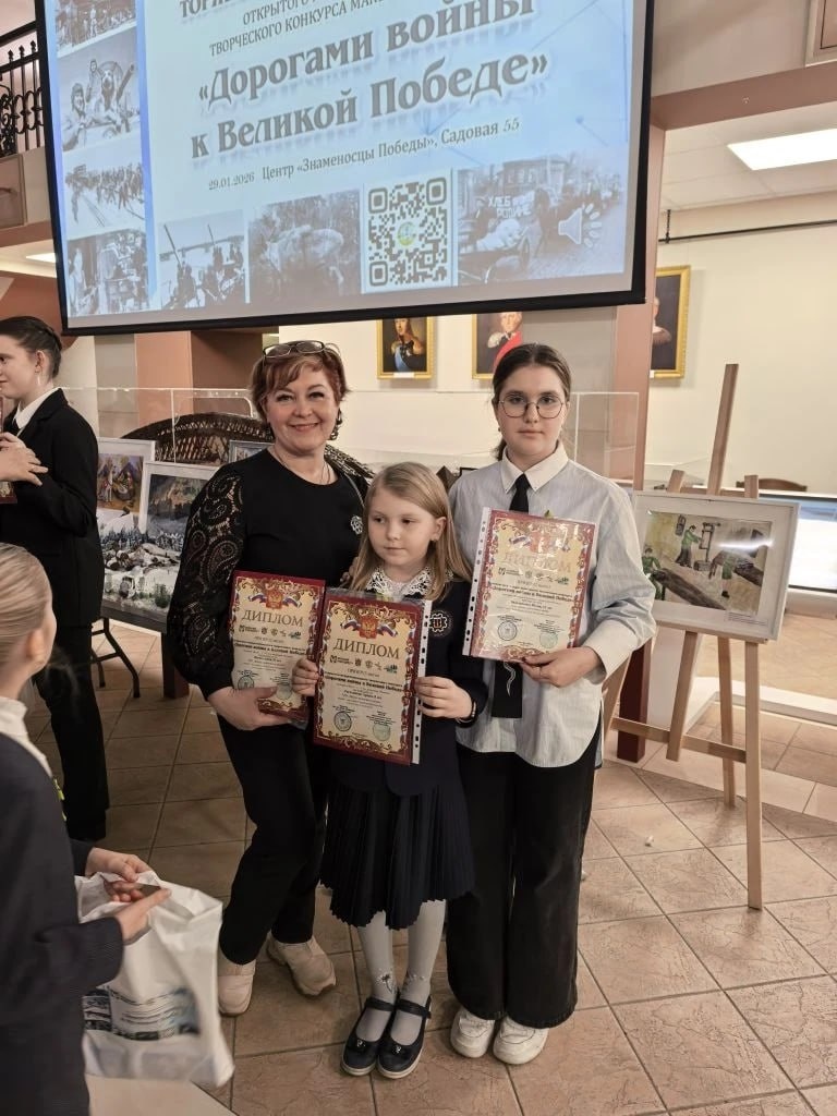 📆 29 января в Музее Мостов состоялась торжественная церемония награждения победителей и призёров открытого межрегионального конкурса «Дорогами войны к Великой Победе». Школа экономики и права второй раз принимает участие в этом значимом патриотическом конкурсе — и вновь очень успешно. ✨ По итогам конкурса наши ученицы заняли призовые места: Номинация «Рисунок», категория 7–11 лет: 🥈 2 место — Жачко Анна, 4А класс. Наставник — Галка Елена Валерьевна. 🥉 3 место — Рогачикова Арина, 2Б класс. Наставник — Галка Елена Валерьевна. Номинация «Рисунок», категория 12–14 лет: 🥈 2 место — Большакова Юлия, 7А класс. Наставник — Попов Фёдор Михайлович. Все участники были награждены дипломами и памятными подарками от сетевых сообществ «Педагоги-Патриоты» и «Отцы России». В этом году тема конкурса была приурочена к Блокаде Ленинграда — одной из самых трагических и героических страниц истории нашего города. Особенно ценно, что работы девочек сегодня представлены в экспозициях Центрального музея