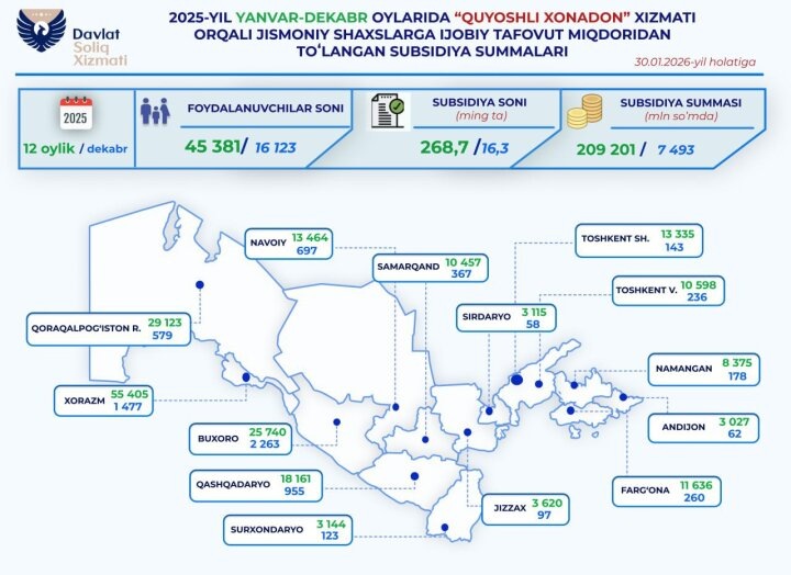 Сообщается, что за 2025 год 45 381 физическое лицо получило субсидии от государства, в размере 209 миллиардов 201 миллиона сумов. Данные субсидии выплачивают лицам, которые установили на своих домах солнечные панели и продают государству электроэнергию, которая излишне вырабатывается их системой.