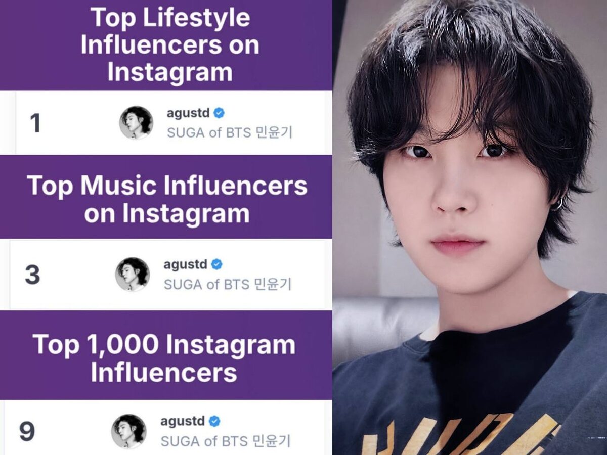 : №1 — самый влиятельный лайфстайл-инфлюенсер. №3 — самый влиятельный музыкант. №9 — в общем рейтинге топ-1000 инфлюенсеров. cr.sakinayoongi #SUGA @kumihobts