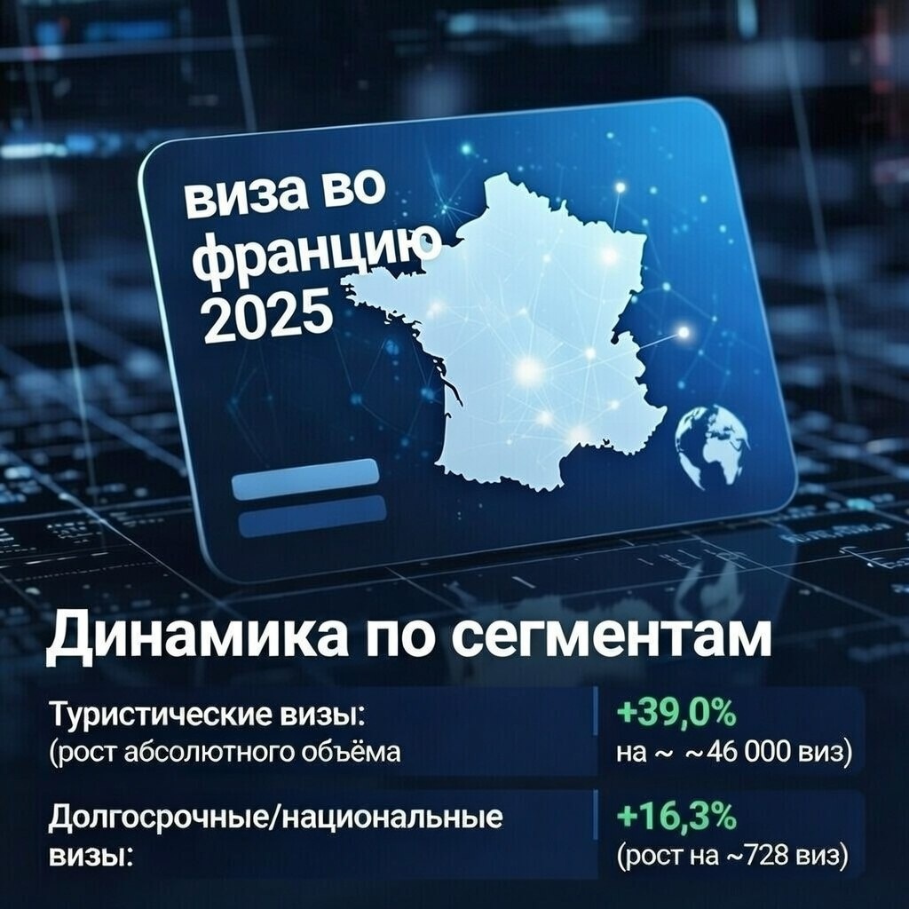 Динамика виз во Францию 2025: туризм рвёт, долгосрочки — вялый рост