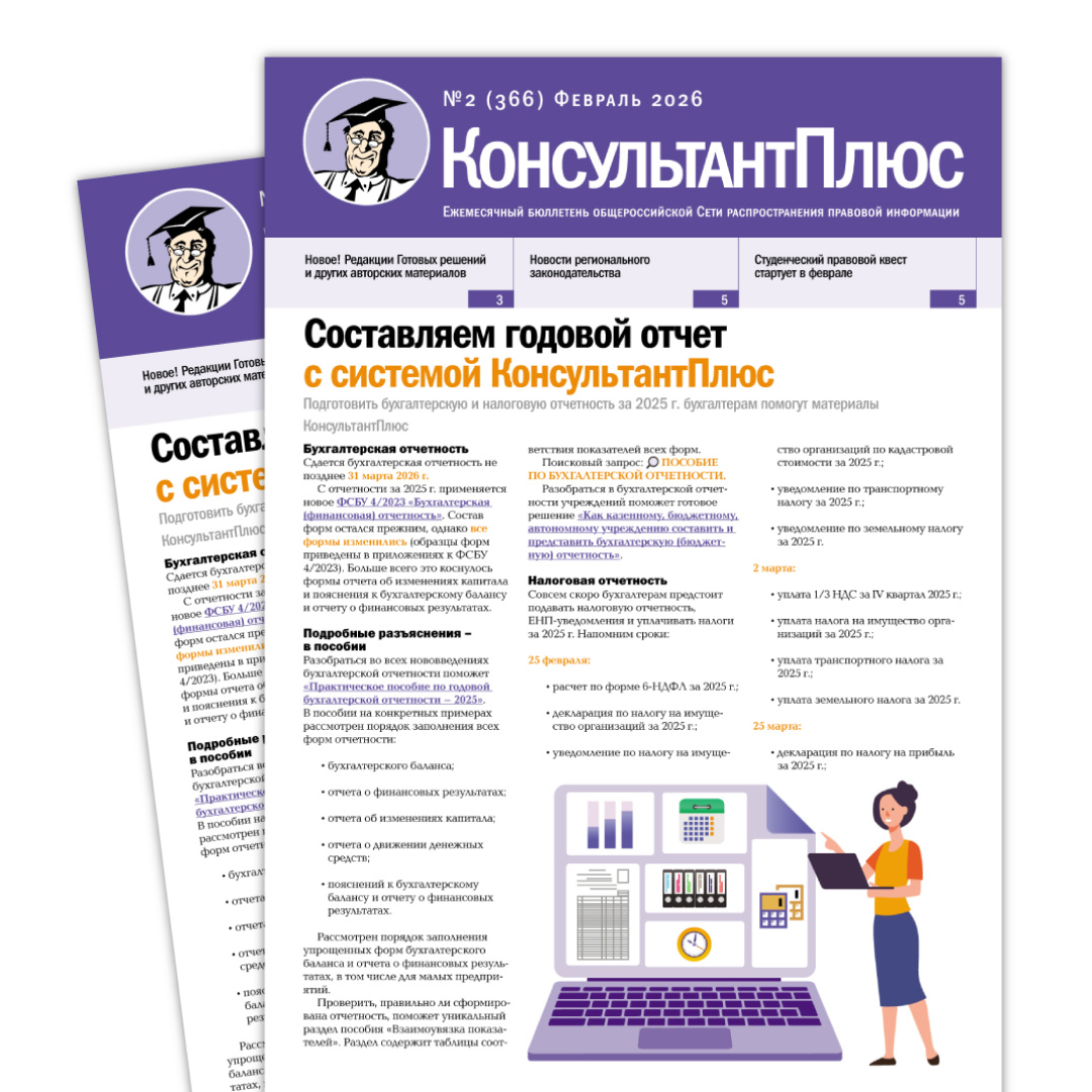 Читайте в выпуске: - «Составляем годовой отчет с системой КонсультантПлюс» - «Новое. Редакции Готовых решений и других авторских материалов» - «Восстановление сроков и подача апелляционных жалоб по ГПК РФ» - «Новости регионального законодательства» - «Новый студенческий онлайн-квест» - «Рассылки КонсультантПлюс: подпишитесь прямо из системы» Перейти к выпуску #консультантплюс #бюллетень_консультантплюс
