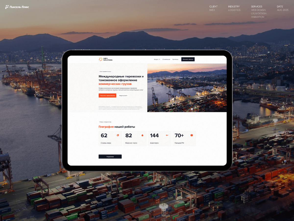 Компания ООО «ИМ ЭКС Солюшенс», специализирующаяся на международных перевозках и таможенном оформлении коммерческих грузов, обратилась с запросом на создание современного корпоративного сайта. Основные проблемы: отсутствовал эффективный онлайн-канал для привлечения клиентов — потенциальные заказчики узнавали о компании только через личные контакты и сарафанное радио; информация об услугах была разрозненна — клиентам приходилось звонить или писать, чтобы узнать подробности о таможенном оформлении, типах перевозок и дополнительных услугах; не было возможности продемонстрировать географию работы и масштаб деятельности — опыт работы с 62 странами, 82 морскими портами и 144 аэропортами не был визуализирован; отсутствовала система сбора заявок — каждый запрос обрабатывался вручную, что замедляло реакцию на обращения клиентов. Цель — запустить профессиональный корпоративный сайт, который будет демонстрировать экспертность компании в международной логистике, автоматизировать сбор заявок и стат