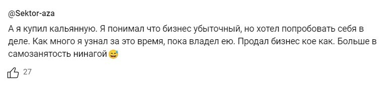 Не обязательно прыгать с парашютом — иногда достаточно купить заведомо убыточный бизнес ;) Один из моих подписчиков решил испытать себя на прочность и приобрел кальянную. Он понимал, что проект в минусе. Однако желание «попробовать себя в деле» перевесило. Итог оказался закономерным. За время владения он прошел жесткую школу выживания и узнал о реальности самозанятости больше, чем хотел. Главный вывод после этого опыта: больше в самозанятость ни ногой.