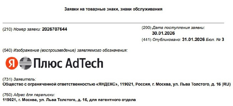 В Роспатент 30 января поступили сразу пять заявок на регистрацию товарных знаков, связанных с новым рекламным подразделением «Яндекса» — Плюс AdTech. Ознакомиться с ними читатели RuHard могут здесь, здесь, здесь, здесь и здесь. О появлении Плюс AdTech «Яндекс» сообщил в конце декабря 2025 года. При помощи данного инструмента бренды смогут размещать рекламу в его сервисах — Кинопоиске, Музыке, Пэй, Книгах, Афише и Плюсе. Их совокупная аудитория — 44,9 млн подписчиков. 📸 Скриншот из базы Роспатента RuHard в Max: https://max.ru/imaxairu