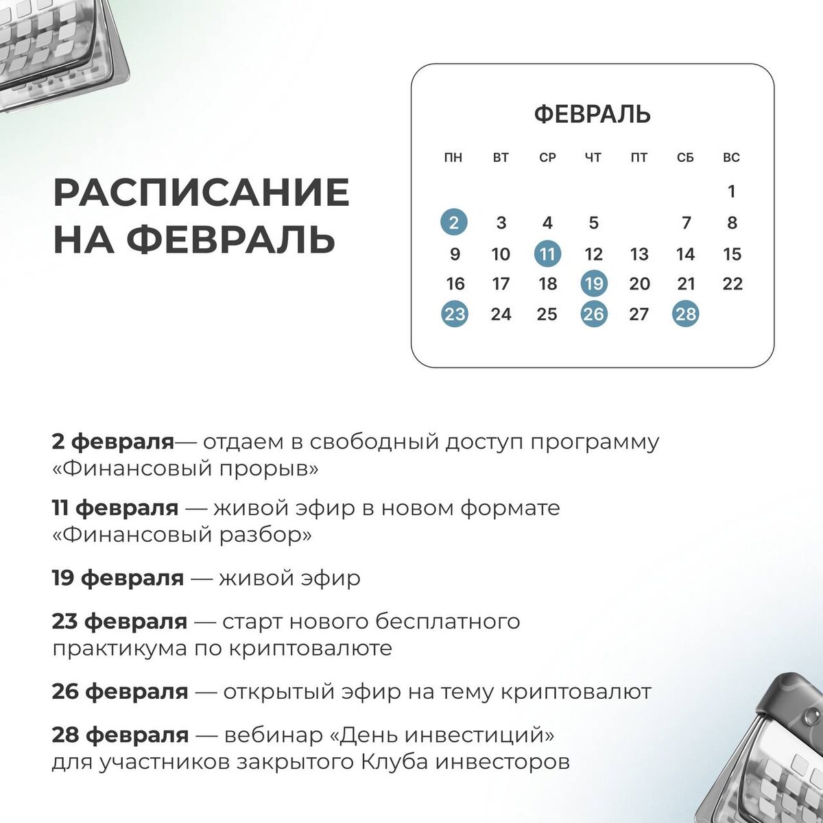 🗓 С началом новой недели, друзья! Для вашего удобства решил сразу расписать по датам все события / мероприятия, которые запланировал на этот месяц. 📎 2 февраля — отдаем вам в свободный доступ программу "Финансовый прорыв". Этот курс многих вывел из долгов, помог создать подушку безопасности, уменьшить расходы и увеличить доходы. 📎 11 февраля — проведу живой эфир, хочу попробовать новый формат «Финансовый разбор» — думаю, вам понравится 😉 📎 19 февраля — еще один живой эфир, тему обозначу позже 📎 23 февраля — стартуем бесплатный практикум по криптовалюте. Курс "Моя первая крипта" мы закрыли, но взамен готовим новый классный материал. О том, как принять в участие, скоро расскажу. 📎 26 февраля — открытый эфир на тему криптовалют. Этот месяц я все больше смотрю в ту сторону. 📎 28 февраля — вебинар «День инвестиций» для участников нашего закрытого Клуба инвесторов Также в феврале доступно для прохождения бесплатное предобучение «Инвест-зарплата». Заносите эти даты к себе в