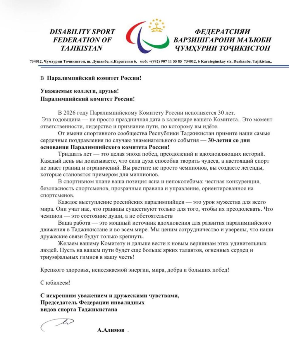 πΠΡΠ΅Π΄ΡΠ΅Π΄Π°ΡΠ΅Π»Ρ Π€Π΅Π΄Π΅ΡΠ°ΡΠΈΠΈ ΠΈΠ½Π²Π°Π»ΠΈΠ΄Π½ΡΡ Π²ΠΈΠ΄ΠΎΠ² ΡΠΏΠΎΡΡΠ° Π’Π°Π΄ΠΆΠΈΠΊΠΈΡΡΠ°Π½Π° ΠΠ±Π΄ΡΡΠ°ΡΠΏ ΠΠ»ΠΈΠΌΠΎΠ² Π½Π°ΠΏΡΠ°Π²ΠΈΠ» ΠΏΠΎΠ·Π΄ΡΠ°Π²ΠΈΡΠ΅Π»ΡΠ½ΠΎΠ΅ ΠΏΠΈΡΡΠΌΠΎ ΠΏΠΎ ΡΠ»ΡΡΠ°Ρ 30-Π»Π΅ΡΠΈΡ