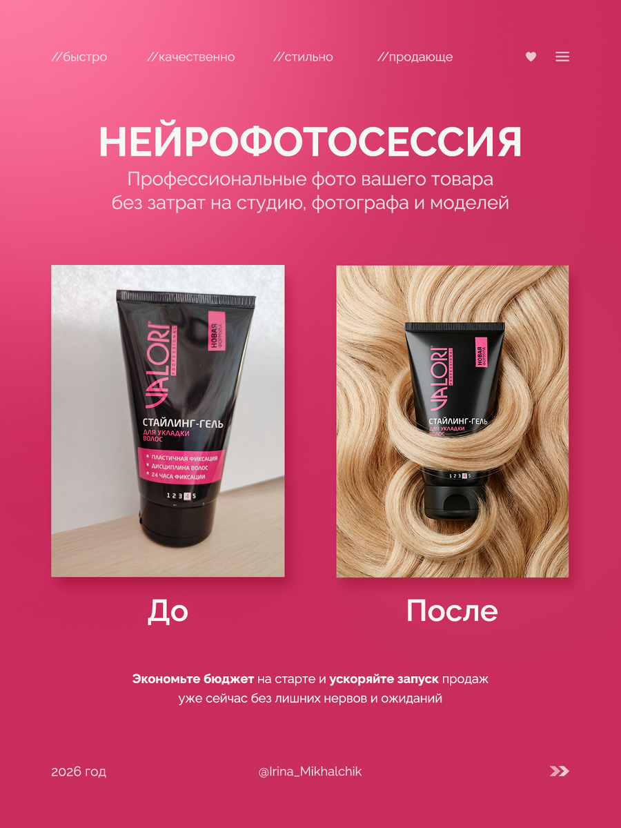Девушка в чёрной коже, уверенный взгляд, безупречные кудри — это не демонстрация продукта, а показ готового образа. Клиент автоматически проецирует его на себя: "Если она такая, то и я смогу". 3. Гель на фоне укладки — доказательство результативности