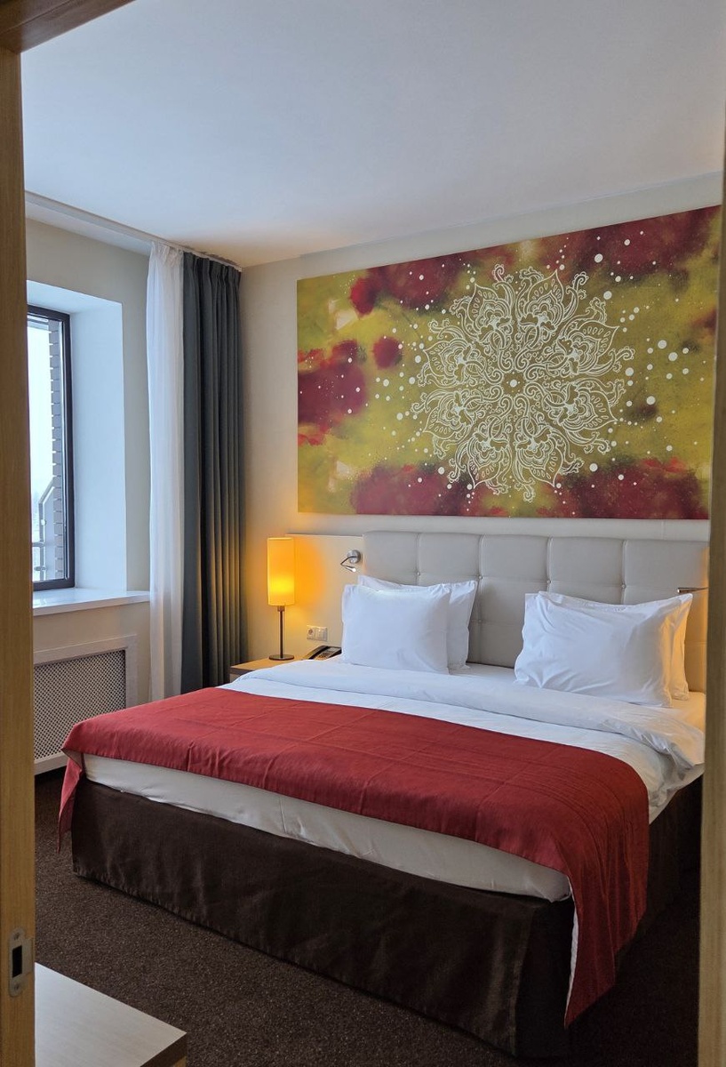 Тоже скромная, и тоже есть всё что нужно – большая кровать, шкаф с фирменными халатами (на мои широкие плечи налез с трудом), телевизор и выход на огромный балкон. Летом там, подозреваю, можно зависать с видом и ощущением «жизнь удалась, никуда не спешим». Ванная комната — ну очень большая. Прямо с запасом. Просторная душевая плюс отдельная ванна — классно, когда можно выбирать. Кремики-шампуники свои, made in Russia, азимутовские — работают только с определенной плотностью воды 😂 Итого: всё ровно по стандартам AZIMUT Hotels. Без попыток удивить, но и без поводов придраться. Рабочая, понятная комплектация — как и должно быть в сетевом парк-отеле. #azimut