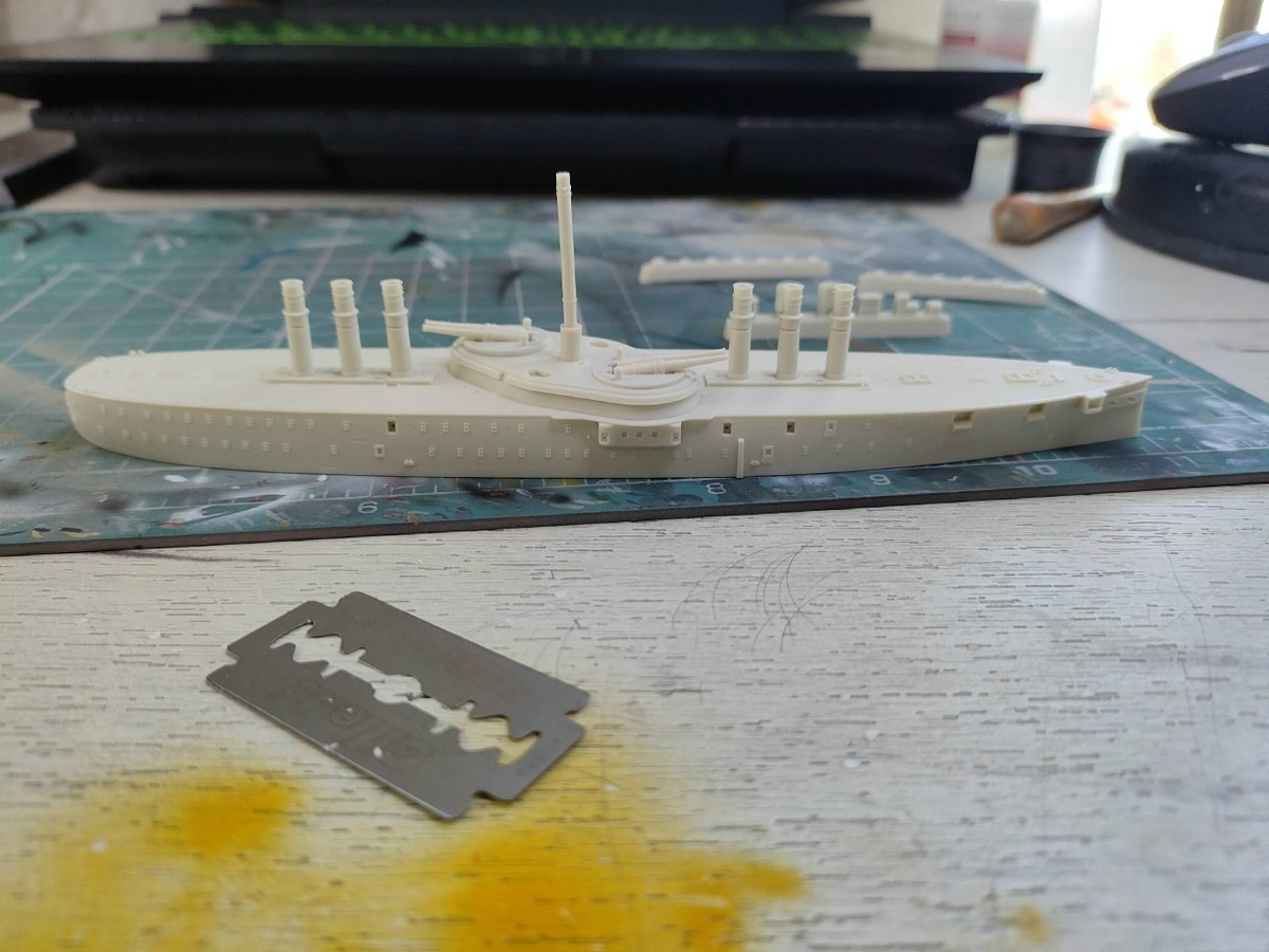 "Комбриг" из Москвы показала примерку дымовых труб и орудий главного калибра на корму своей смоляной модели итальянского броненосца "Италия" в масштабе 1/700.