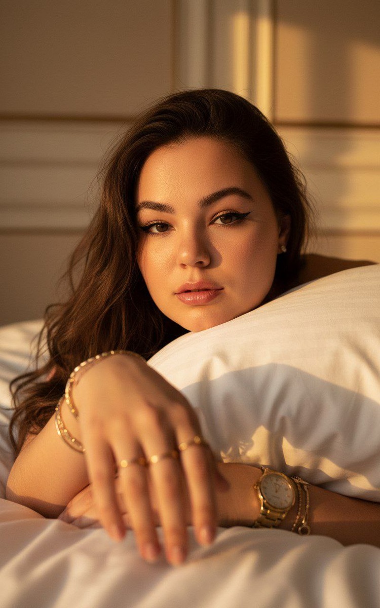 😀Выбираем "нейросети" 😀Нажимаем "Nano Banana" 😀Нажимаем "Nano Banana Pro" 😀Прикрепляем через скрепку свое фото и выбранный промпт 😀Наслаждаемся результатом🫶 Создай фото не меняя черты лица и цвет волос.Вертикальный ультрареалистичный кинематографичный портрет: молодая женщина лежит на кровати в тёплом золотом свете. Съёмка с уровня ног, малая глубина резкости, эффектная перспектива — её рука с золотыми часами и украшениями в резком фокусе, взгляд притягивает к лицу. Длинные волосы рассыпаны по подушке, кожа сияющая с лёгким загаром. Макияж чувственный: cat-eye стрелки, длинные ресницы, нежно-розовые приоткрытые губы. Интерьер в кремово-бежевых тонах с мягкими тенями и деревянными акцентами. Лёгкое плёночное зерно, тёплая цветокоррекция, высокая детализация глаз и золота. Атмосфера: роскошь, уютная, high-end fashion editorial.