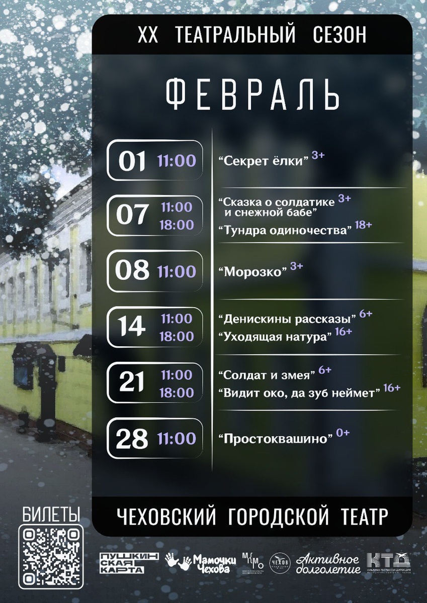 ✨ Афиша ФЕВРАЛЬ ‘26 уже здесь! 👀 Спешим поделиться с вами афишей на февраль Чеховского городского театра 🏢 «ЧЕХОВСКИЙ ГОРОДСКОЙ ТЕАТР» 📍 г. Чехов, ул. Московская, д.40 🔗 Купить билет: https://iframeab-pre6643.intickets.ru/shows/ ⭐Поддержать канал голосом ✅ Мероприятия Чехов https://dzen.ru/id/66cc4b48e9ef144699238a51 http://vk.com/chekhov_events http://dzen.ru/chekhov_events