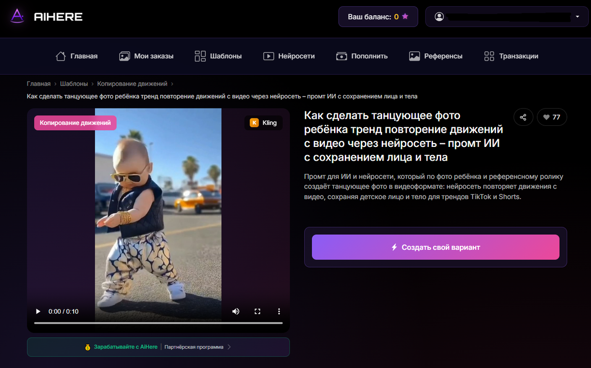 Хотите увидеть, как ваш ребенок зажигает на танцполе в крутом видео? С сервисом AIHere это реально за пару минут - нейросеть клонирует лицо с фото и накладывает на любое танцевальное видео. Пошаговая инструкция: 3 этапа для видео с танцующим ребенком через ИИ Готовый промт в AIHere упрощает всё до минимума. AIHere выигрывает по простоте - для родителей без ИТ-навыков. Kling AI – это китайская нейросеть от Kuaishou, лидер в создании видео с технологией Motion Control. Она анализирует фото и "приклеивает" его к любому телу из видео. Полное повторение лица – это face swap с ИИ, где алгоритмы учатся на миллионах селфи и танцев. Готовы попробовать? Переходите в AIHere прямо сейчас, сделайте первое видео и покажите в комментариях, как ваш малыш "танцует" через ИИ. Какой танец выберете - K-pop или народный? Жду ваши истории! В моем тесте на фото 6-летки с генерация видео с лицом ребенка вышла супер-реалистичная - глазки бегают, губы двигаются в такт музыке. Никаких глюков! Еще один плюс: так