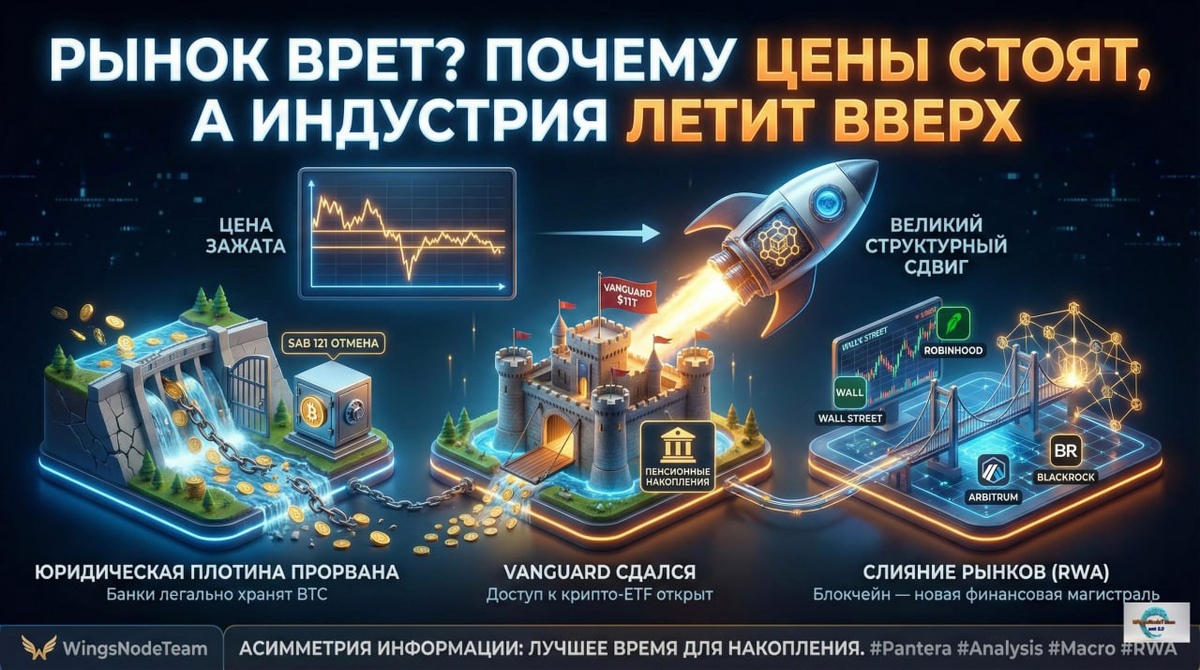 Мы проанализировали нашумевший тред от Panterafii, который сейчас обсуждает весь смарт-мани сектор. Пока ритейл паникует из-за красных свечей, под капотом рынка происходит "Великий Структурный Сдвиг". Вот 3 факта, которые рынок еще не заложил в цену: 😀 Юридическая плотина прорвана В 2025 году мы получили то, чего ждали 10 лет: ясность. 😀Отмена правила SAB 121 означает, что теперь банки могут легально хранить Биткоин клиентов. 😀Это открывает шлюзы для корпоративных казначейств. Если раньше покупка BTC для компании была юридическим адом, то теперь это стандартная процедура. 😀 Vanguard сдался Гигант с $11 трлн активов, который годами ненавидел крипту, разрешил своим клиентам покупать крипто-ETF. 😀Инсайт: Это не спекулятивные деньги. Это пенсионные накопления. Они заходят медленно, но навсегда. Это создает "бетонный пол" для цены Биткоина. 😀 Слияние Рынков (RWA) BlackRock и Robinhood не просто "играют в крипту". Они переносят Уолл-стрит на блокчейн. 😀Кейс: Robinhood запускае