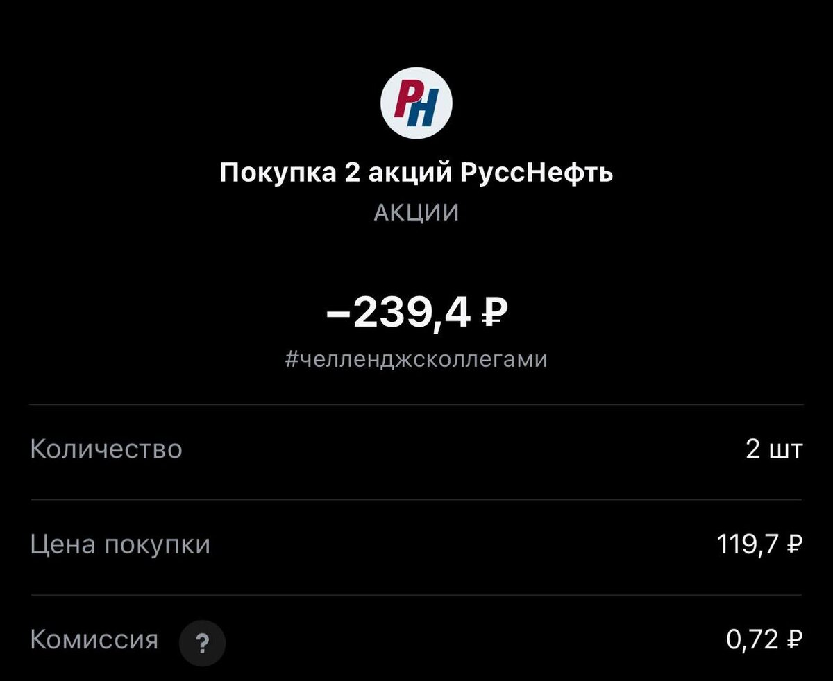 ! Покупка на сегодня #358 Статистика портфеля на стороннем сервисе, можно посмотреть по "ссылке" Напомню это челлендж с коллегами, каждый рабочий день пополняем брокерский счет на 250 рублей и инвестируем. Если возникли вопросы или есть не понимание, что делать. Задавайте «тут» Покупка #358 🟢 «РуссНефть» 119.7 rub #RNFT 2 лота #каждыйсможет #челенджсколлегами ✈️ Стас Мироненко
