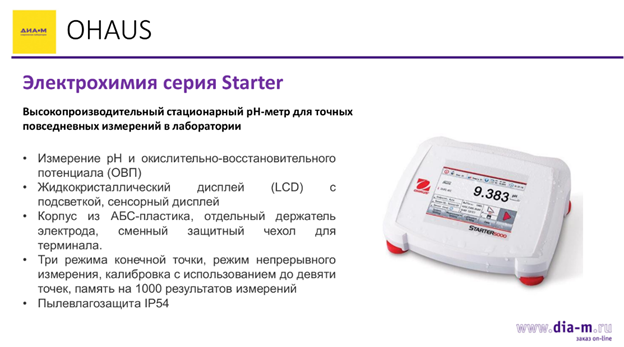 • интуитивно понятным управлением. Несмотря на название серии Starter, это не «начальный уровень», а продвинутые лабораторные приборы, успешно применяемые в научных и производственных лабораториях. Д