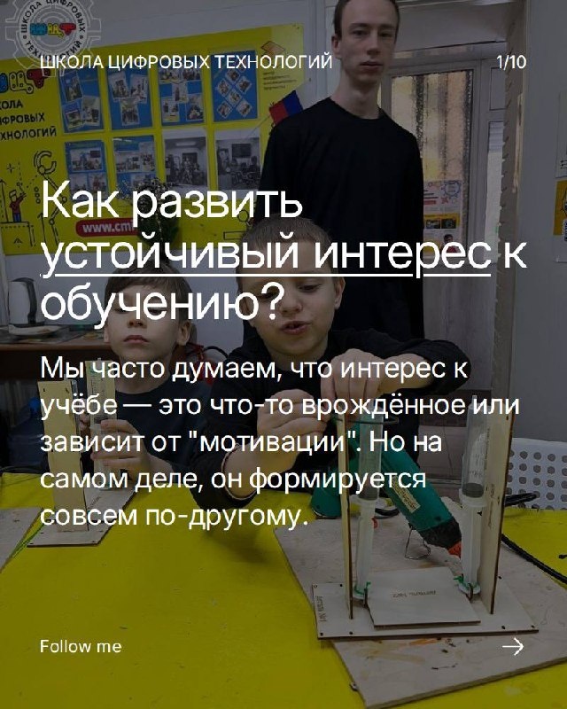 Он формируется через опыт. Почему важно, чтобы ребёнок доводил проекты до конца? Как завершение задачи влияет на мотивацию и уверенность? И в чём разница между быстрым дофамином от экрана и устойчивым интересом к обучению? Мы собрали это в карусели — листайте и посмотрите, как проектная работа помогает ребёнку стать не подражателем, а создателем и исследователем.