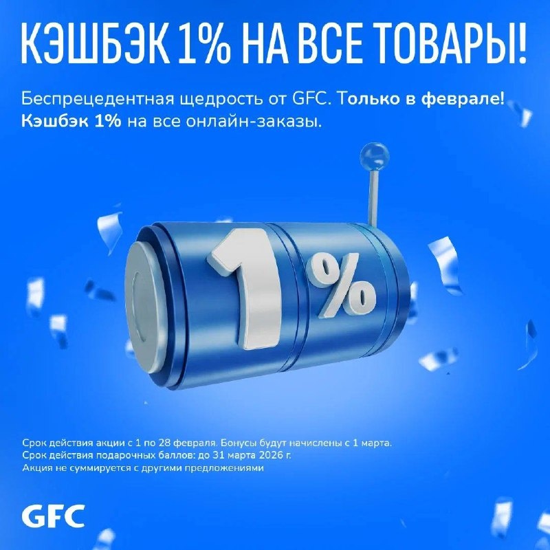 %! Представляете? Возвращаем баллами 1% за все онлайн-заказы в феврале ❤️🔥 Скорее оплачивайте корзины, чтобы сэкономить еще и в марте. Ведь бонусы начисляются с 1 марта, а списать их можно будет до 31. Оформить заказ можно на сайте или в приложении GFC 💙