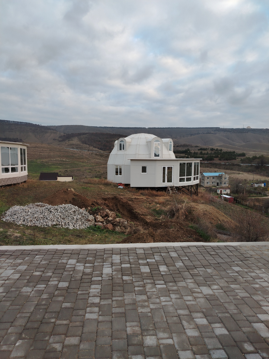Объект находится в Орджоникидзе, в СНТ Рассвет-2. Может, кто обращал внимание: по дороге из Феодосии в Орджоникидзе в этом СНТ на горе стоят купольные дома.
