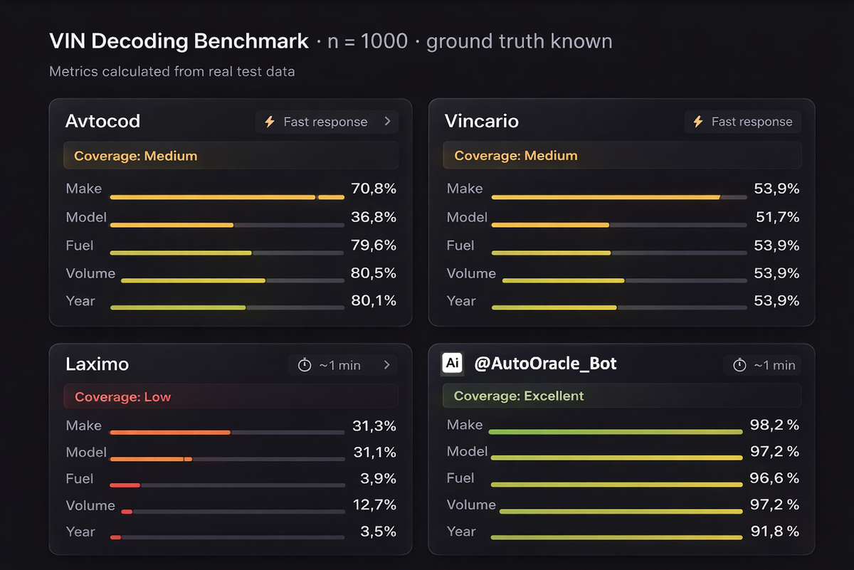 Автор: Болховский Дмитрий, Aftermarket-DATA©. AI/ИИ – трансформация компаний, LLM-агенты, аналитика Тг канал «ИИ-Стратег» https://t.me/s/BolkhovskyInsight Сравнение результатов ИИ со стандартными API: Avtocod, Vincario, Laximo. В тесте – 1.000 VIN из нашей eCom Результаты классических сервисов (не ИИ): • Avtocod — лучший по охвату (хотя бы 1 параметр) • Vincario — самые полные данные по комплектации • Совокупная точность всех трёх — ~80% Результат нейронки: • 98% VIN расшифрованы • 92% — полная расшифровка всех параметров Победа ИИ, в целом, ожидаемая. Алгоритм устойчив к типовым ошибкам ввода: I/O/Q, кириллица/латиница, неполный VIN, работает поиск похожих. Минусы: Стоимость токенов и время ответа ~1 мин. Применение: Единый ИИ-слой для e-commerce, CRM, умный поиск по каталогам (TecDoc), превращение запроса клиента в структурированные данные. 👉 Протестировать: https://t.me/AutoOracle_Bot 💬 API и партнёрство email: