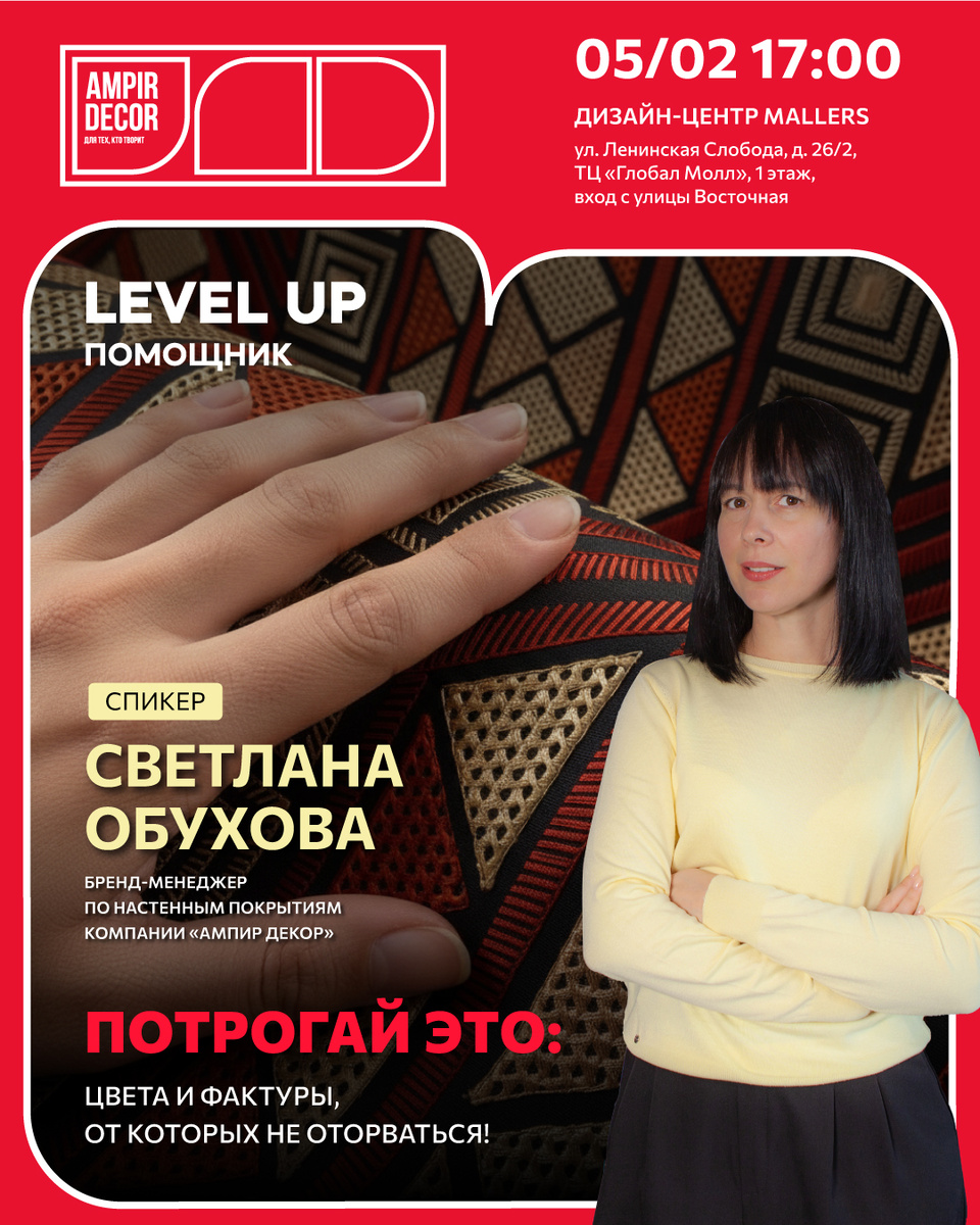 📅 Четверг, 5 февраля, 17:00 📍 Дизайн-центр Mallers 🚨 Вход свободный по регистрации https://event.ampir.ru/ Спикер 🎤 Светлана Обухова, бренд-менеджер по настенным покрытиям компании «Ампир Декор» Расскажем и покажем: 🧶 Новые коллекции Arte, Omexco и Masureel: натуральные текстуры, роскошные панно, крупные цветочные мотивы, яркие этно‑узоры и плавные градиенты.